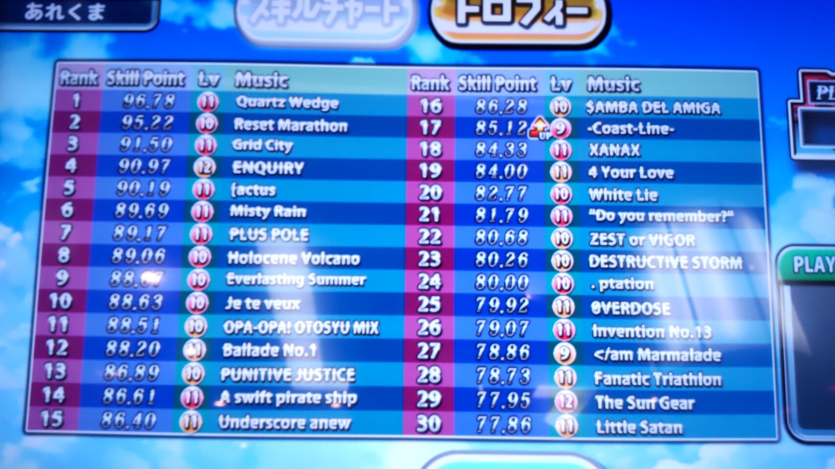 スキルチャート撮ったけど、ここに載ってる曲は選択画面でマーク付いてるのに気づいたでもランク外で伸ばせそうな曲探すには必要かこのあと実際に80切ってる曲を伸ばしてちょっと入れ替わった