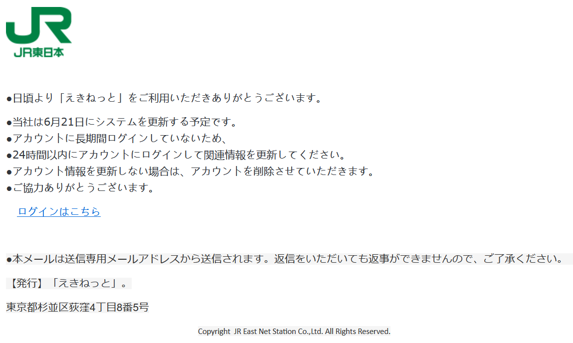 えきねっと自動退会詐欺のフィッシングメールまだ来ると思ったらものすごい劣化してて笑ってしまう。