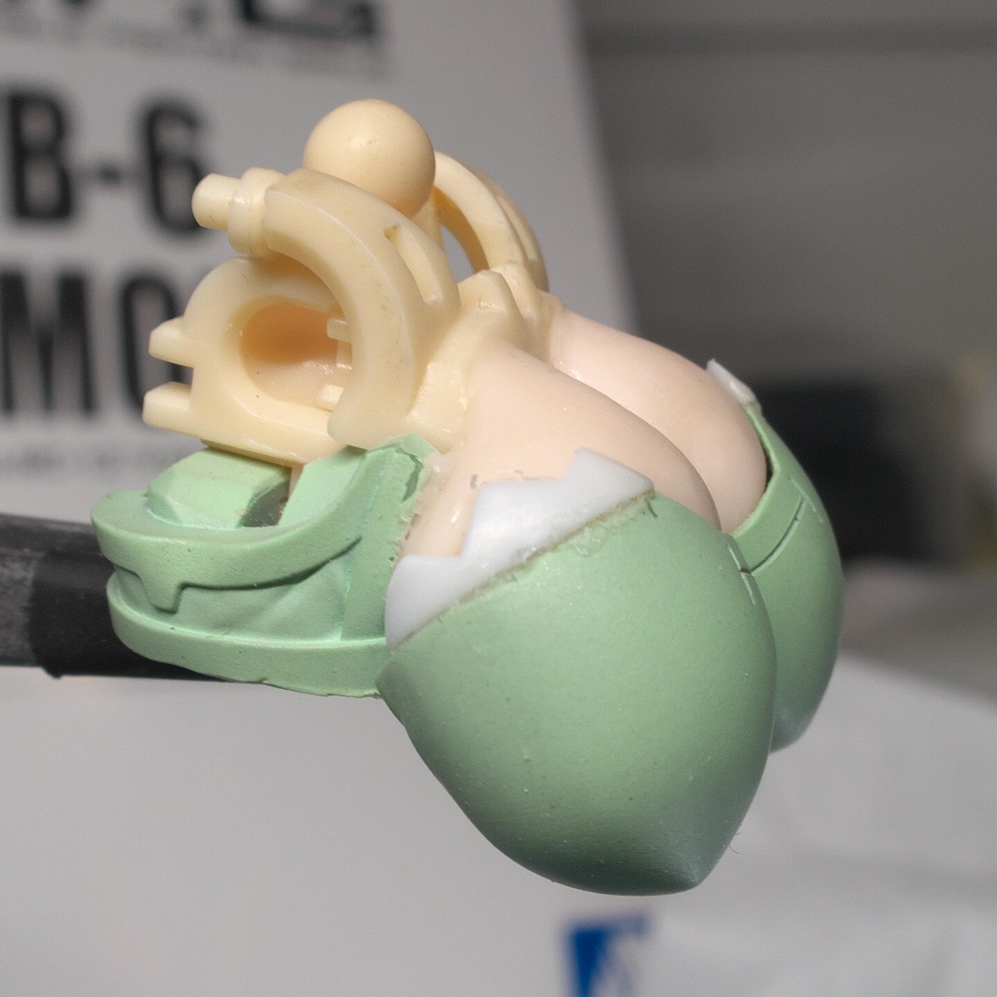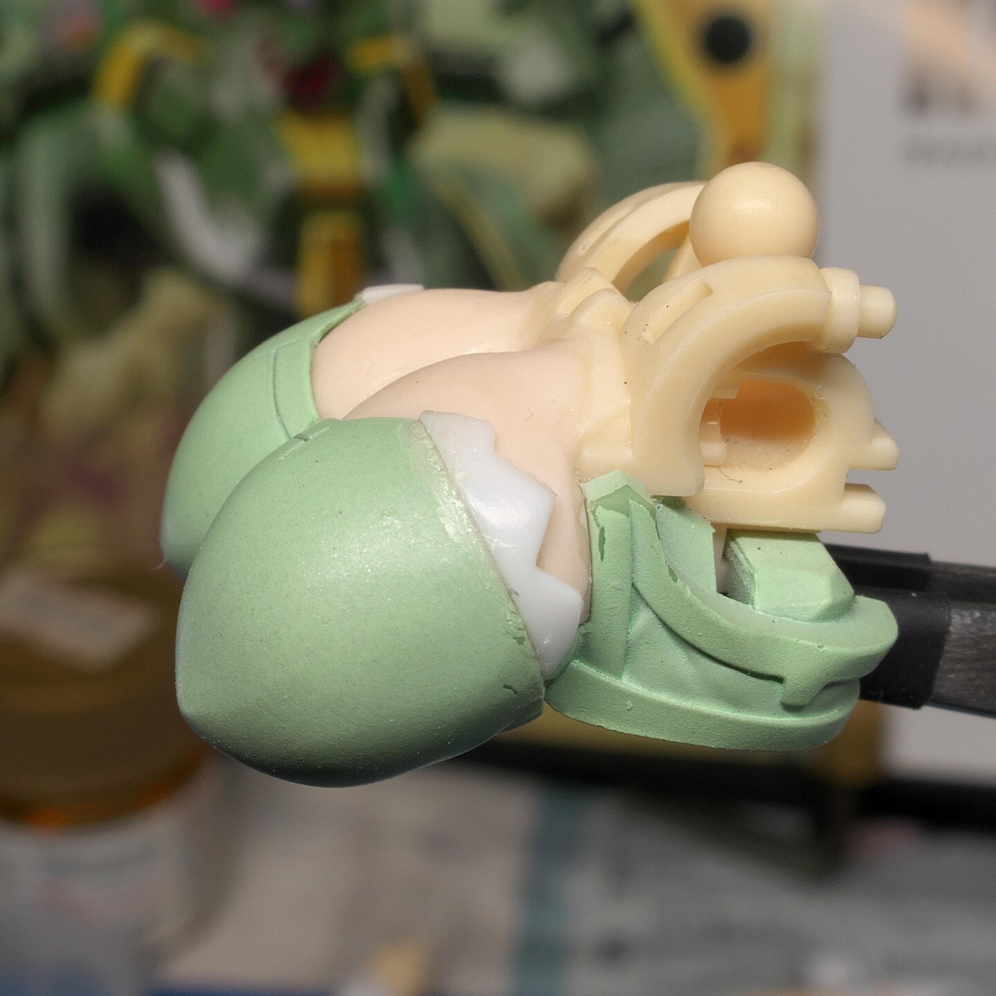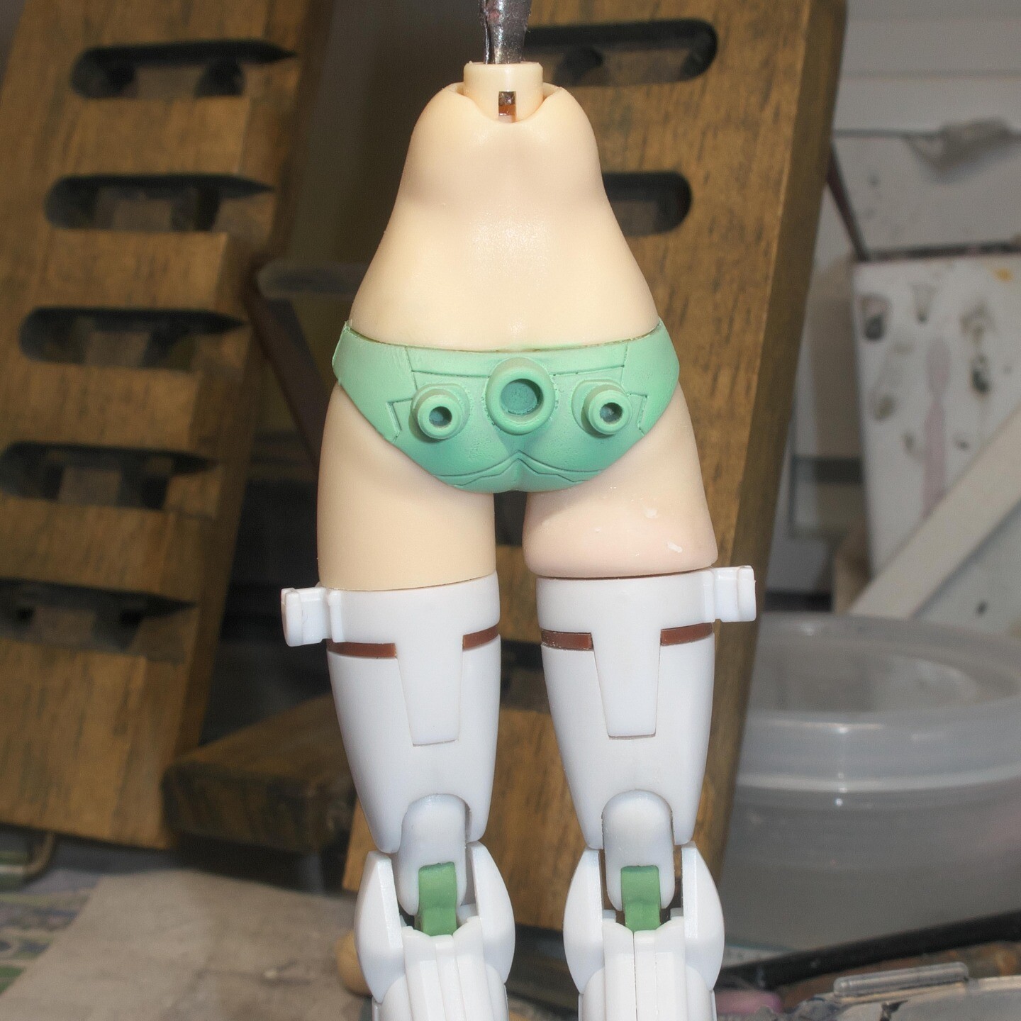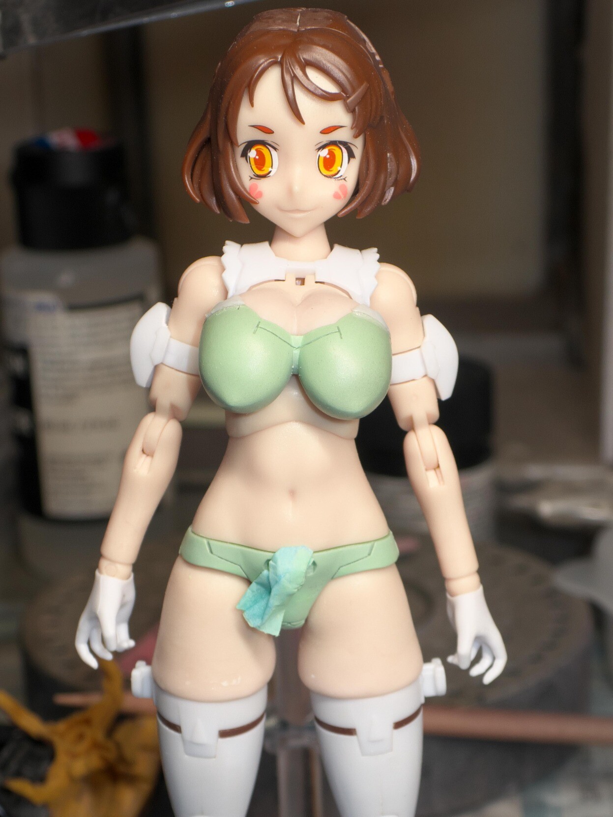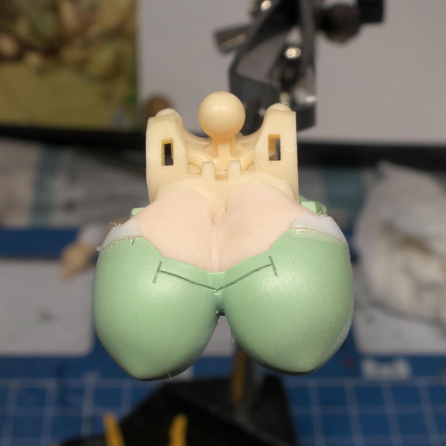 元からでかいんですがパーツの厚みのせいで胸部装甲が厚く見えてしまうので、胸の服パーツを削り込んで薄くし、肌色側を限界まで盛り込んで中身がでかい感を出しました。