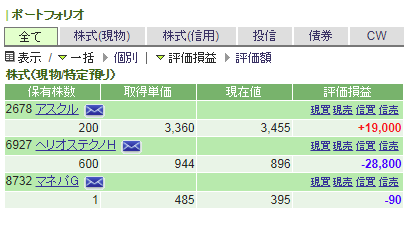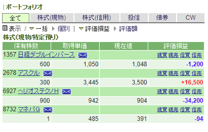 アスクルを損切り、ダブルインバ利確でノーポジになった。